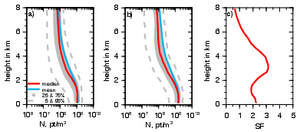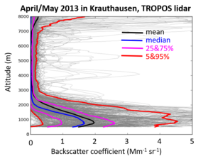 The aerosol and CCN (cloud condensation nuclei) profiles derived from COSMO-MUSCAT as an input for ICON-LEM are evaluated using measurements from HD(CP)² supersites. Multiwavelength lidar is the main instrument for this purpose. Statistical measurement data as shown below is used to evaluate the aerosol-model output for certain sites on a statistical basis as shown below.