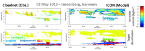 Furthermore, a mixed-phase cloud data set derived from the HD(CP)² supersites (Cloudnet stations) is used to evaluate ICON-LEM with respect to mixed-phase clouds on a statistical basis. Therefore, a Cloudnet-conform target categorization is derived from the ICON output for which then the same algorithms for mixed-phase cloud characterization can be applied as to the measurements. Finally, the model and the measurements statistics of for example cloud top height vs. ice mass flux can be compared.